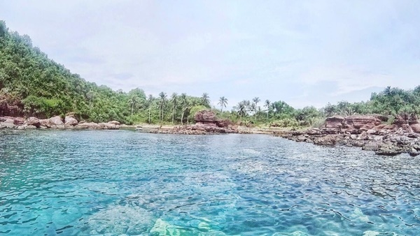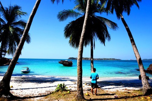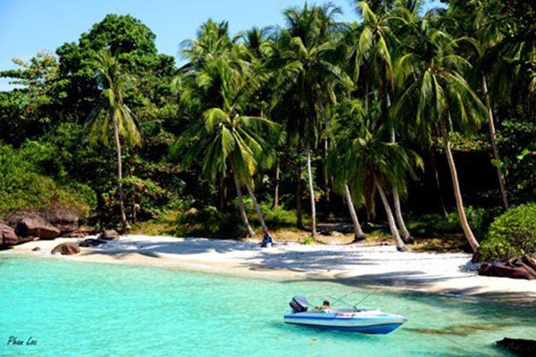 Đi ca nô ra khơi, hòn đảo từ xa đã hiện ra với một vùng xanh của cây trái và những bóng dừa mát rượi, mặt nước sáng như gương màu xanh ngọc bích cùng bãi cát trắng mịn trải dài.